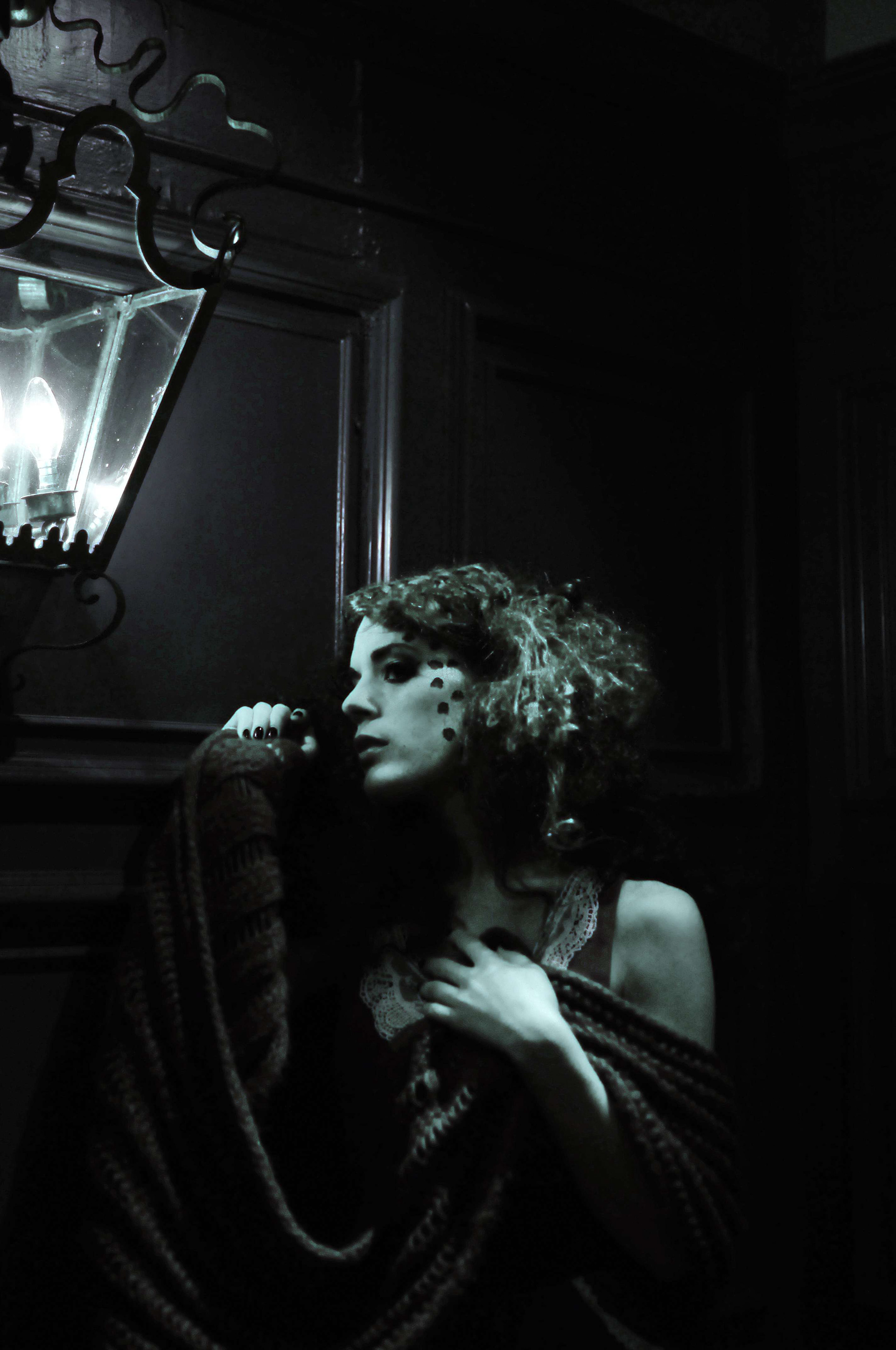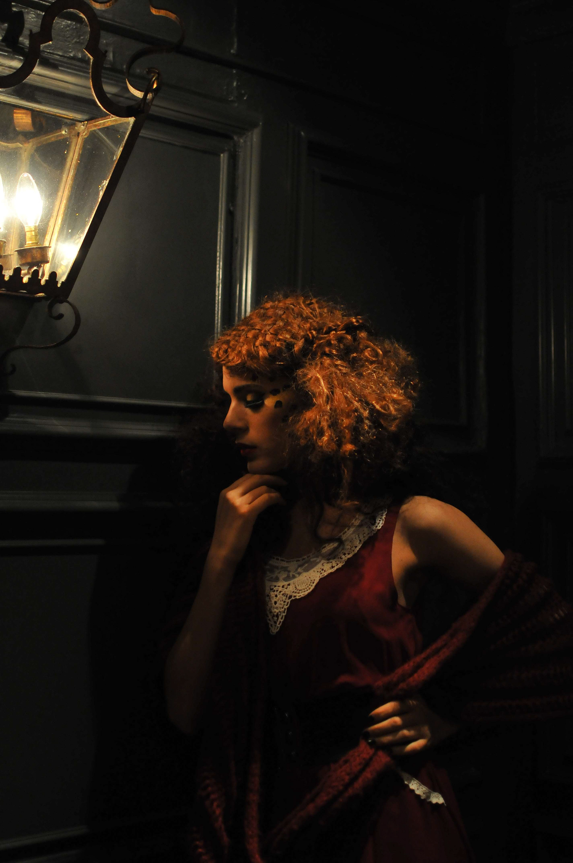 Young woman standing under a light at night